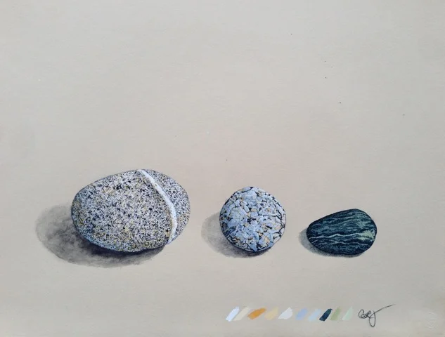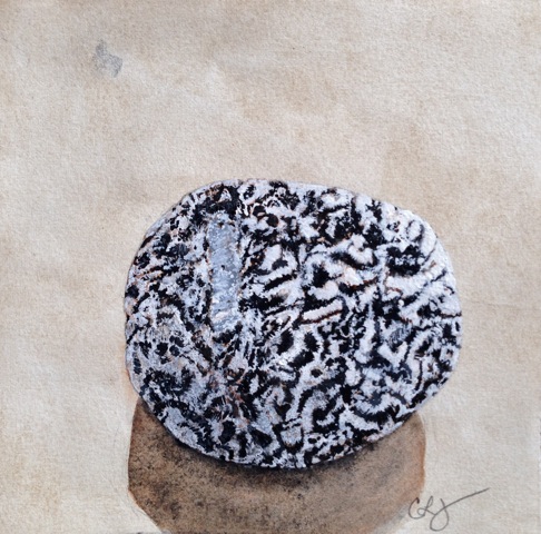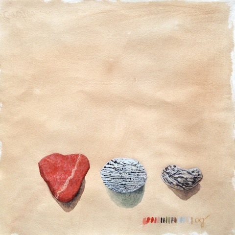 After the initial work of crisis control I walked the edges of the flooding creek and on the sand bars that formed as water receded. When I looked past the ancient uprooted cottonwoods, plastic bottles, corrugated metal, a suitcase filled with silt, a child's yellow sand bucket, I saw beauty. I saw wondrous rocks everywhere - water-rounded granite, pink pegmatite sparkling with mica, milky quartz. Some were heart-shaped, all were gifts from the flood. I wanted to paint them, but first I needed to get my paper muddy. I soaked it in the flood water, scooped up mud and rubbed it in, then left it to dry in the sun. When I rinsed off the mud the paper had become beautiful shades of biscuit and buff sandstone. It was mottled, wrinkled…it was perfect. Painting the stones marked my acceptance of both the power and beauty of the flood, and the destruction it caused.